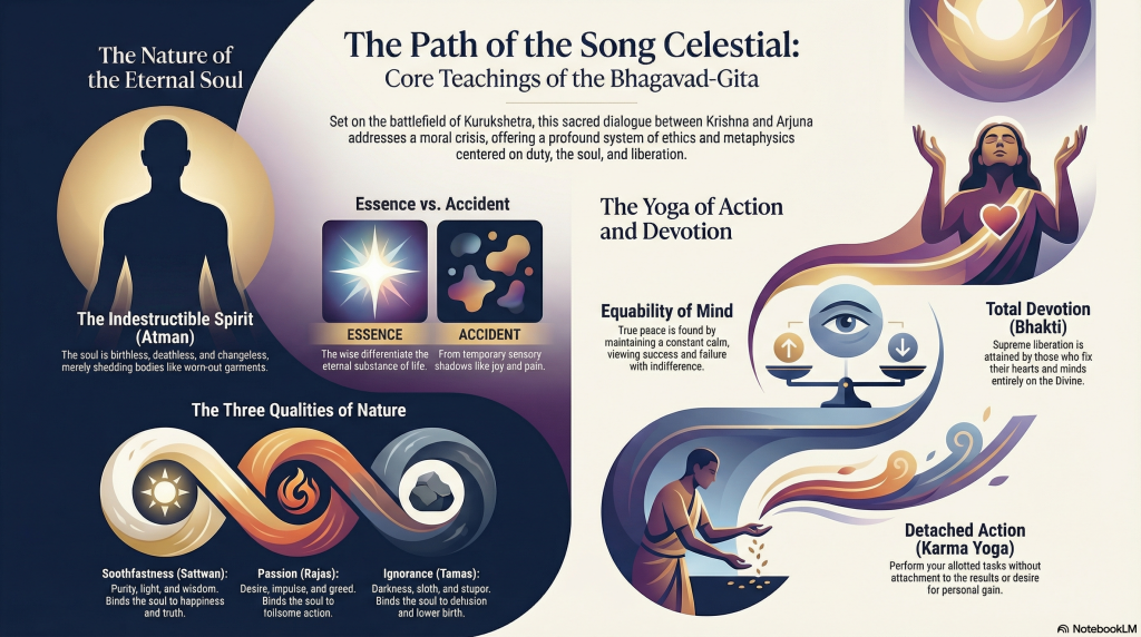 The Bhagavad-Gita suggests that peace is not the absence of external conflict, but the presence of “self-governance” and “steadfastness” in the midst of it. By focusing on the purity of the deed rather than the reward, and by understanding the strings that move us, we can walk the “farther path” toward a life of purpose.