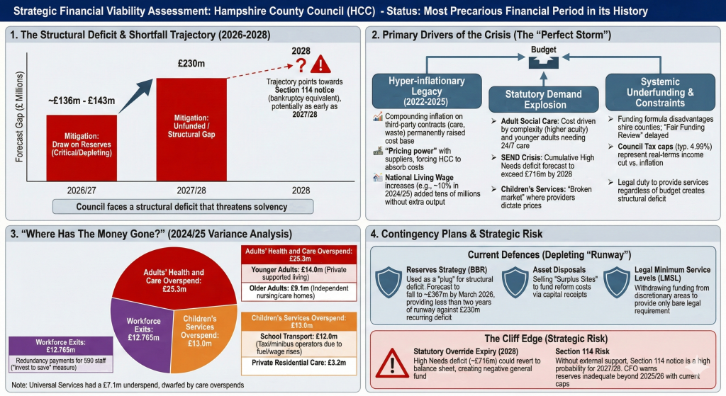 This report presents a comprehensive financial viability assessment of Hampshire County Council (HCC) as of February 2026. It has been commissioned to evaluate the Authority’s funding outlook, quantify potential shortfalls over the medium term (2026-2031), analyze the root causes of the prevailing fiscal distress, and interrogate the contingency measures currently in place. Furthermore, the report provides a forensic analysis of expenditure trends to answer the critical stakeholder question: “Where has the money gone?”